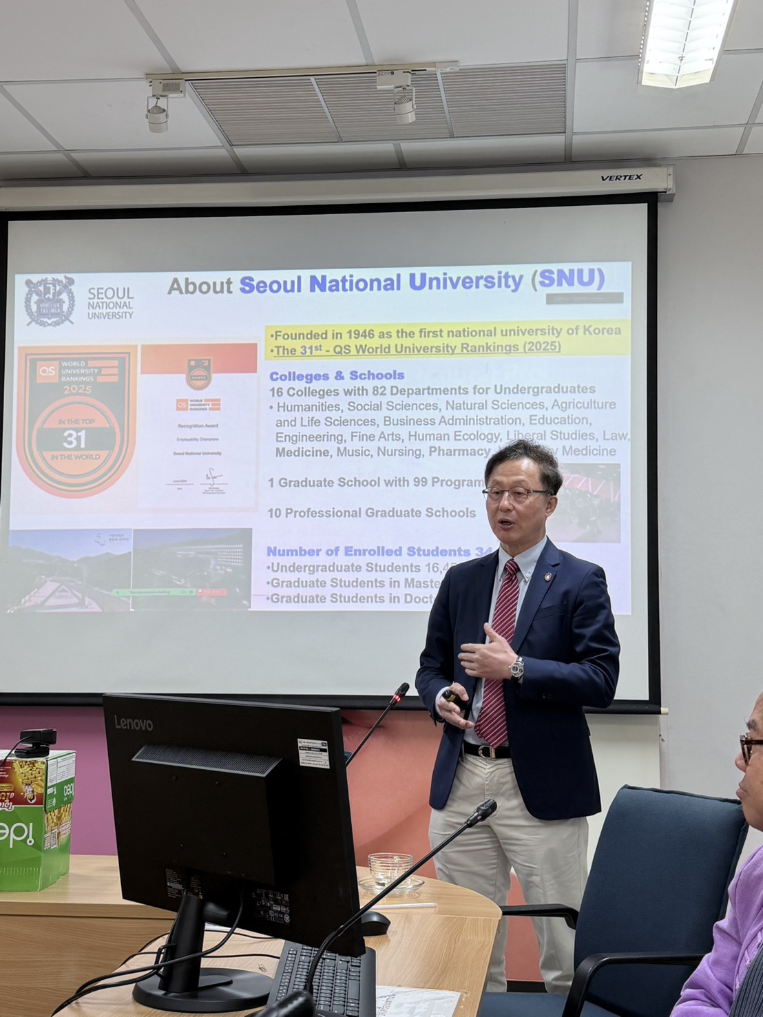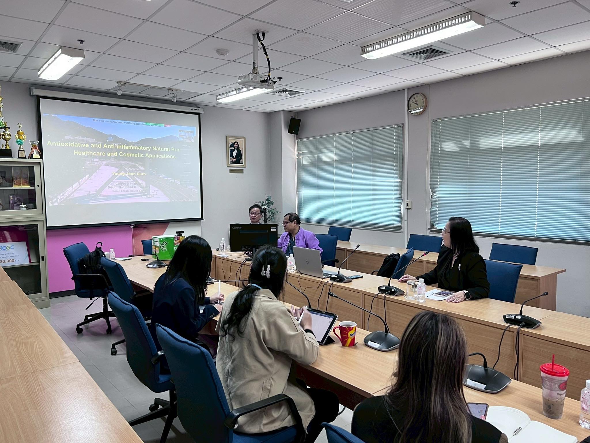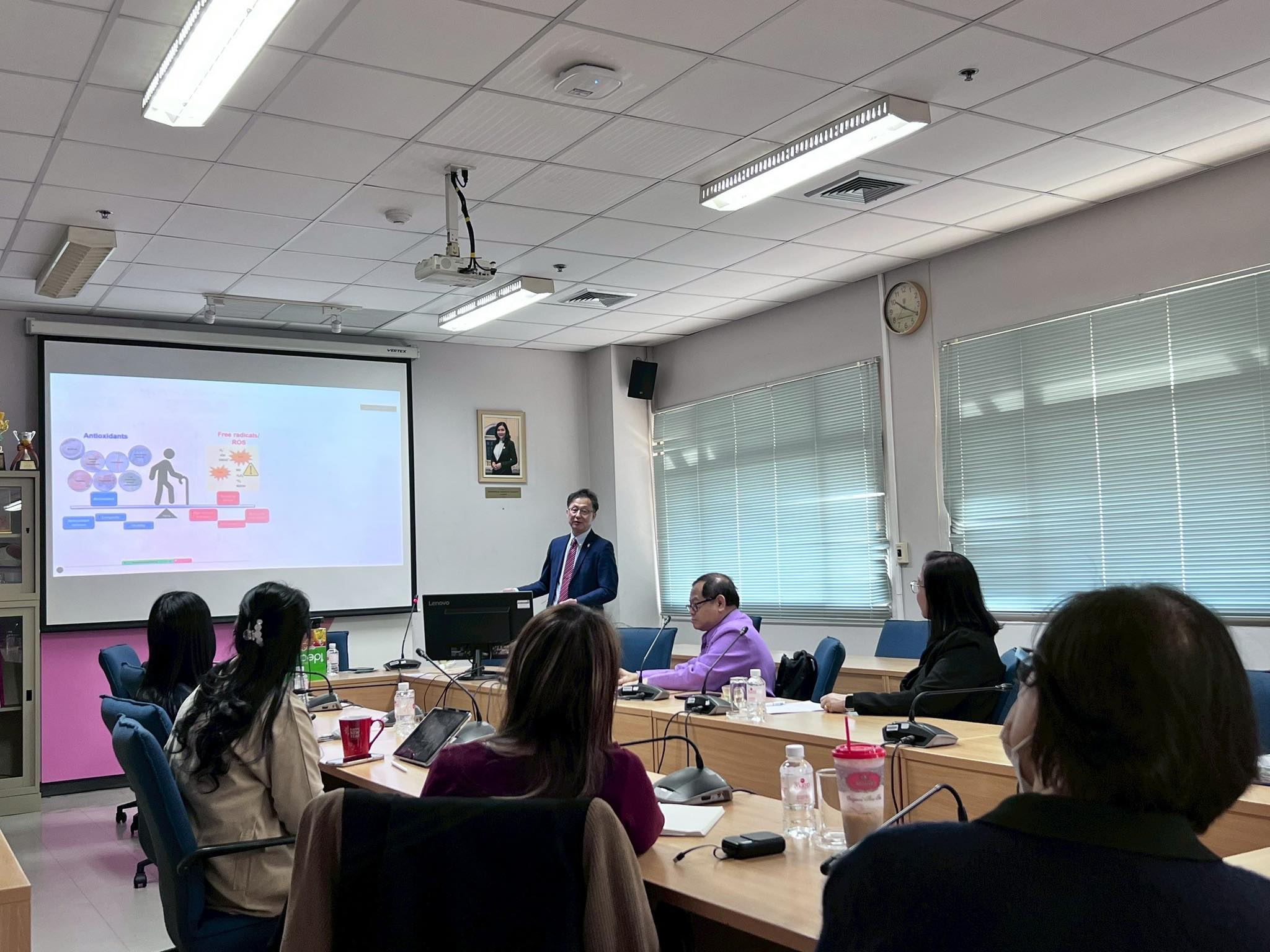 Assoc. Prof. Dr. Wandee Rungseevijitprapa, Dean of the School of Cosmetic Science, presided over the session. She highlighted that this academic exchange is a core component of the project “Innovation in Cosmetics for Sustainability and Creative Economy,” funded by the Reinventing University 2026 program.
